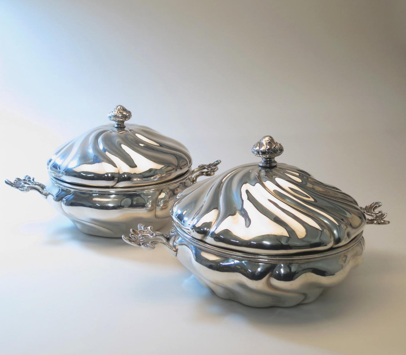 Silber. Runde Form mit gedrehten Zügen und Rocaille-Handhaben. Ca. 2460g. Höhe 17 cm, Ø 20cm.