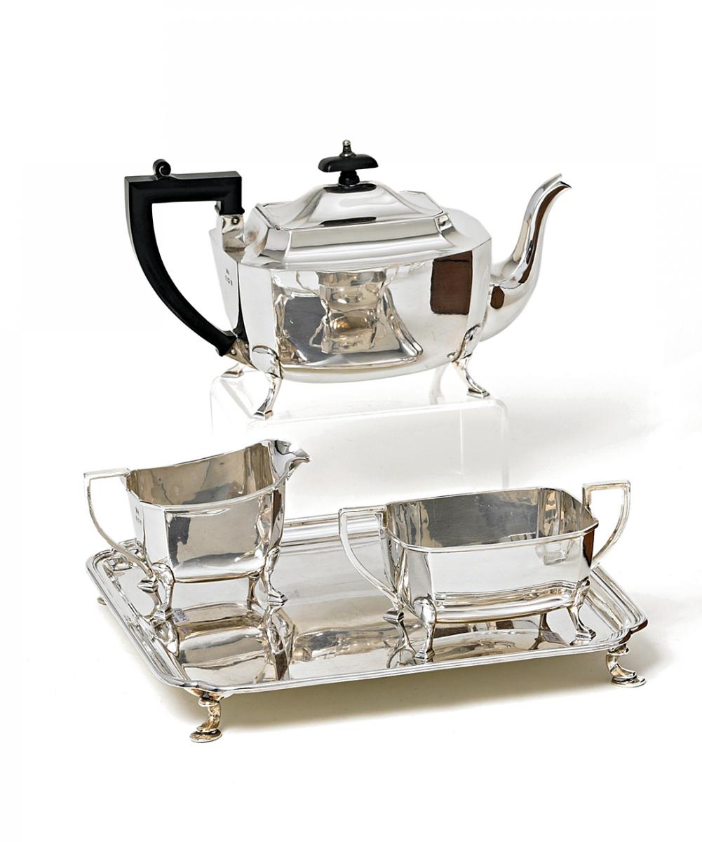 a) Service: Beschau Birmingham 1932-33, Meistermarke ALD (A.L. Davenport Ltd., ab 1928). b) Salver: Beschau Sheffield 1945-46, Meistermarke M & W (Mappin & Webb Ltd., ab 1892). Zustand A-A/B.