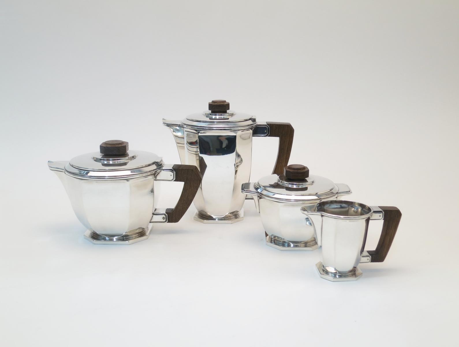 Silber. Holzhenkel und -knauf. Bestehend aus Kaffeekanne, Teekanne, Zuckerdose und Milchgießer. Ca. 1828g. Höhe der Kannen 18/13,5cm.