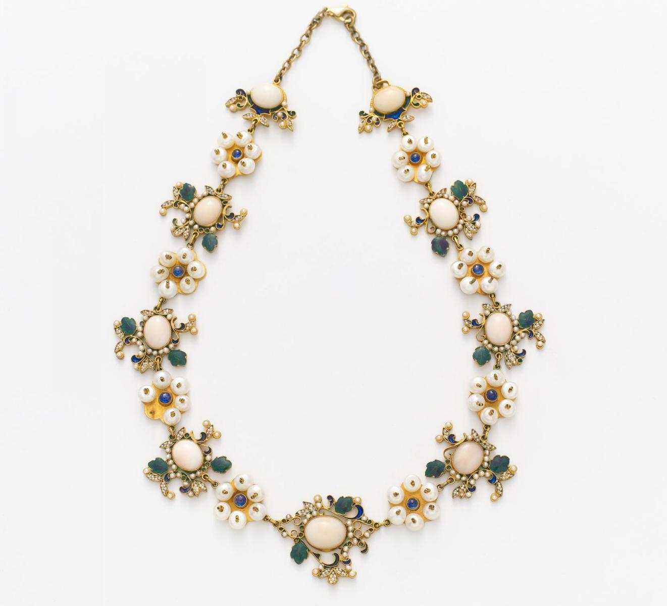 Goldfarben, farbiges Email, Gewicht: 74,0g. L.ca. 42,5cm. 8 Saphir-Cabochons, D.ca. 3mm, 9 Korallen-Cabochons, D.ca. 10 x 8mm, vielzählige Saatperlen (teilweise fehlend).