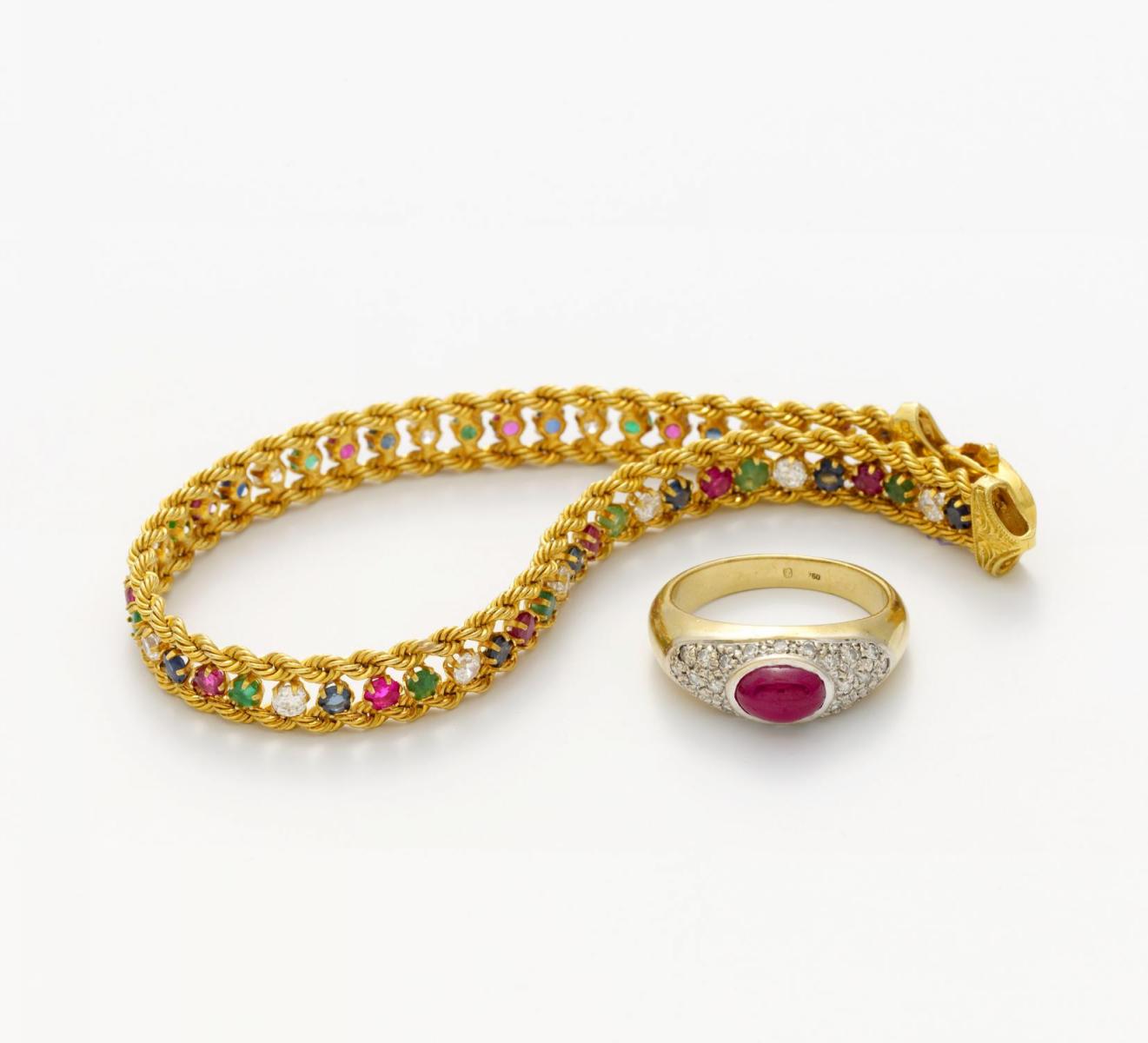 Ring: 24 Diamanten im 8/8-Schliff, 1 ovaler Rubin-Cabochon. Armband: 12 Diamanten im