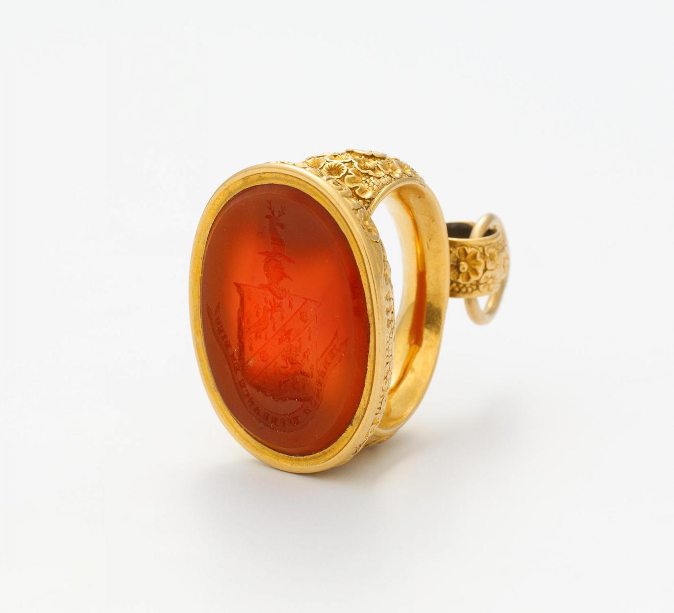 Goldfaben, Stempel (unleserlich), Gewicht: 32,0g. Anh.: H. x B. 5,0 x 3,5cm. Ovaler Karneol D.ca. 3,5 x 3,0cm, Familienwappen handgraviert.