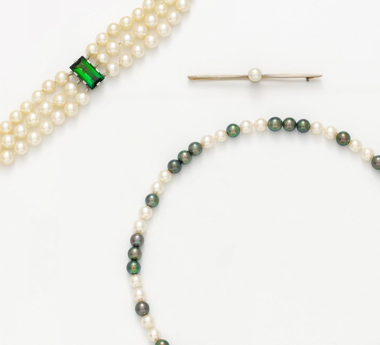 Beilage: 1 schwarz-weißes Süßwasser-Zuchtperl-Collier, 3 kleinere Stränge von