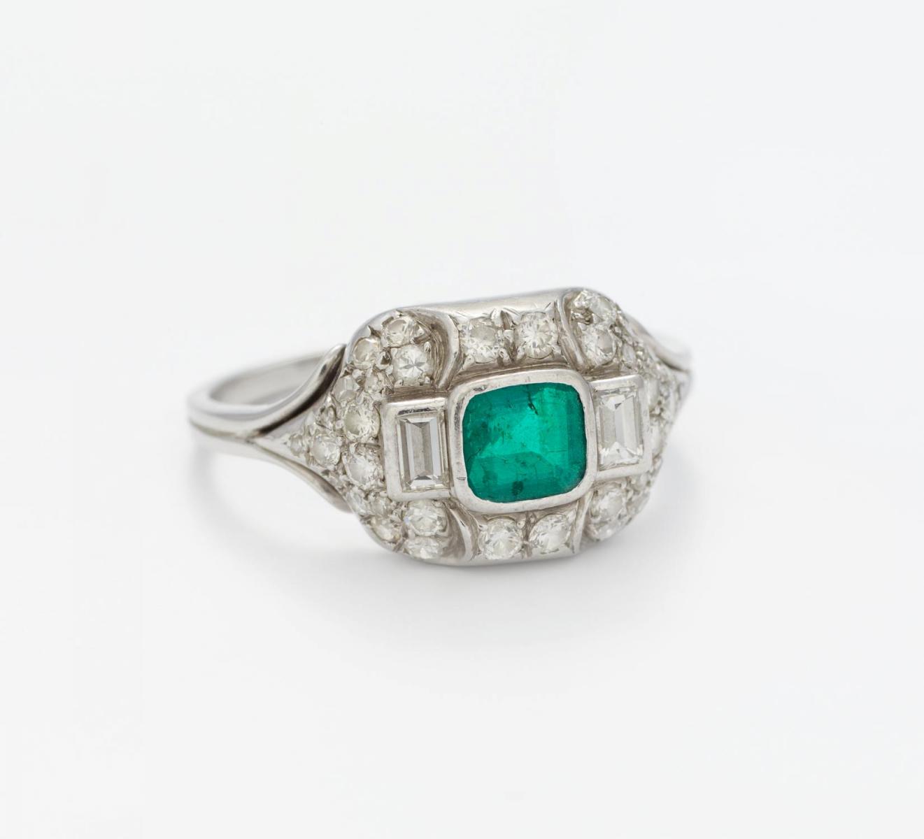 750/- Weißgold, gestempelt, Gewicht: 5,9g. EU-RM: 60,5. 2 Diamant-Baguettes, 34 Diamanten im Brillant- und 8/8-Schliff, 1 Smaragd im Emerald Cut.