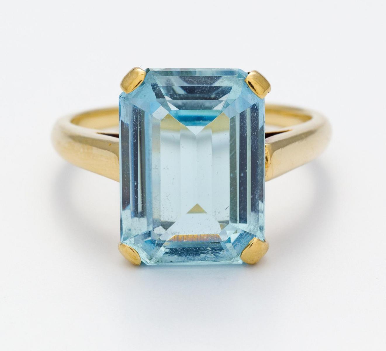 585/- Gelbgold, gest., Gewicht: 6,4g. EU-RM: 56. 1 facettierter Aquamarin im Treppenschliff, H x B=ca. 1,4 x 1,0cm.