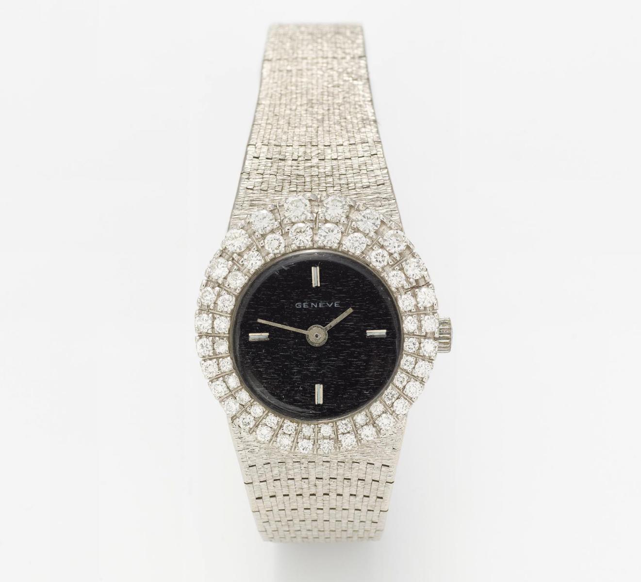 Handaufzug. 750/- Weißgold, gestempelt, Zffbl. schwarz, Zeiger/Indizes silbern/weiß, Diamantlünette. Gewicht: 46,5g. L.ca. 16,5cm, D.ca. 2,8 x 2,1cm.