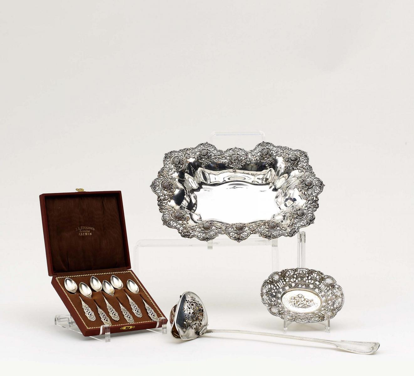 Beschau, Jahresbuchstabe, Meistermarke verschlagen/ Mondsichel & Krone, Feingehaltsmarke 800, Firmenmarke. Zustand A-A/B. Beilage: 6 Mokkalöffel und Konfektschälchen.