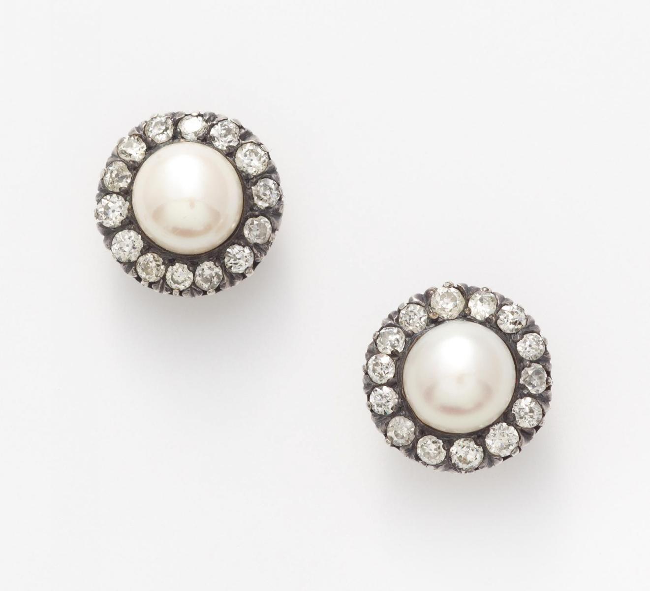 Goldfarben, Silberverbödung, Gewicht: 4,7g. D.ca. 1,7cm. 28 winzige Altschliff-Diamanten, 2 Zuchtperl-Buttons, creme-rosé, D.ca. 8,1mm.