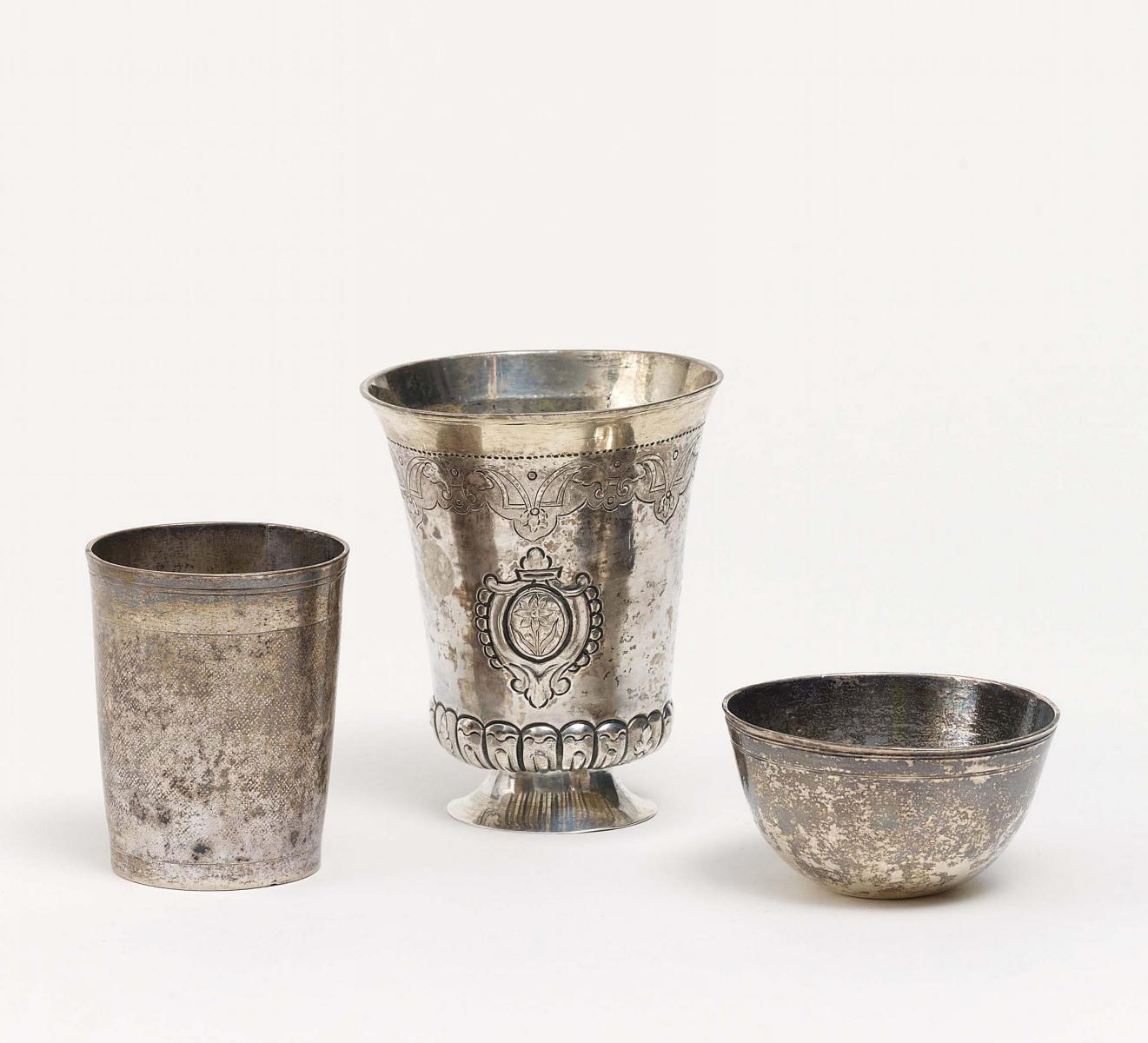 KONVOLUT SCHLANGENHAUTBECHER, KLEINER BECHER UND BECHER MIT KARTUSCHENZIER.