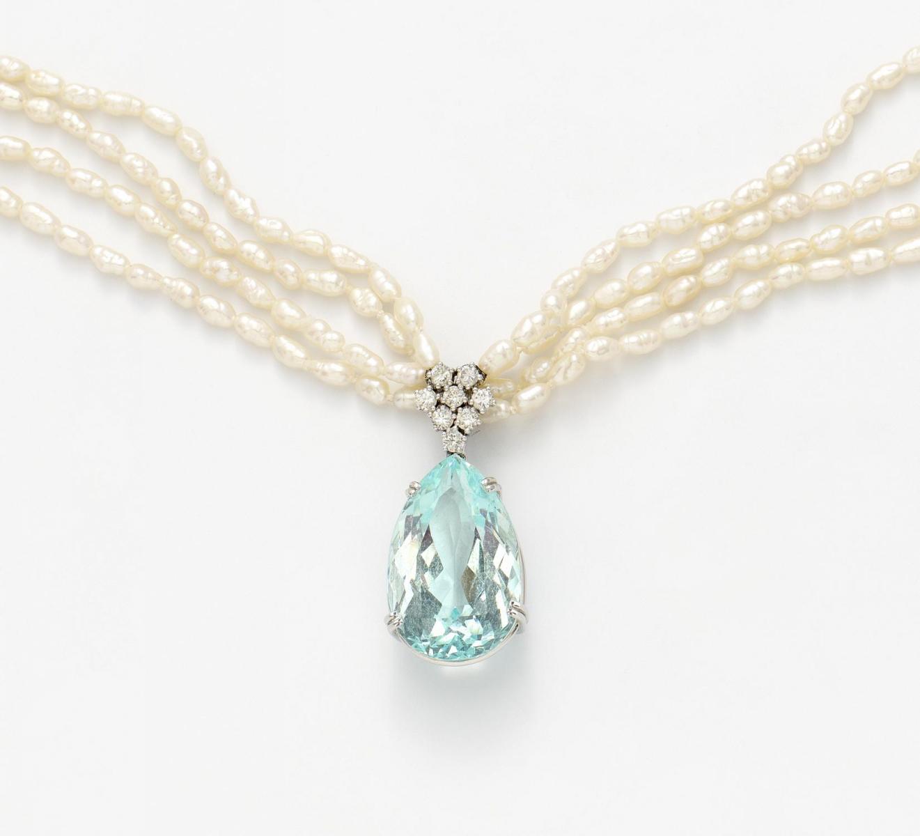 Anh. und Zierschloss 585/- Weißgold, gestempelt, Gewicht: 28,5g. L.ca. 49,0cm, Anh. H x B=ca. 3,3 x 1,5cm. 8 Brillanten, 1 facettierter Aquamarin im Tropfenschliff D.ca. 23 x 14mm, 4-reihiges Zuchtperlcollier, weiß-rosé.