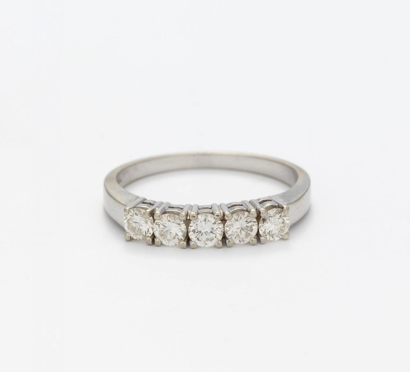 590/- Weißgold, gestempelt, Gewicht: 3,3g. EU-RM: 58. 5 Brillanten.