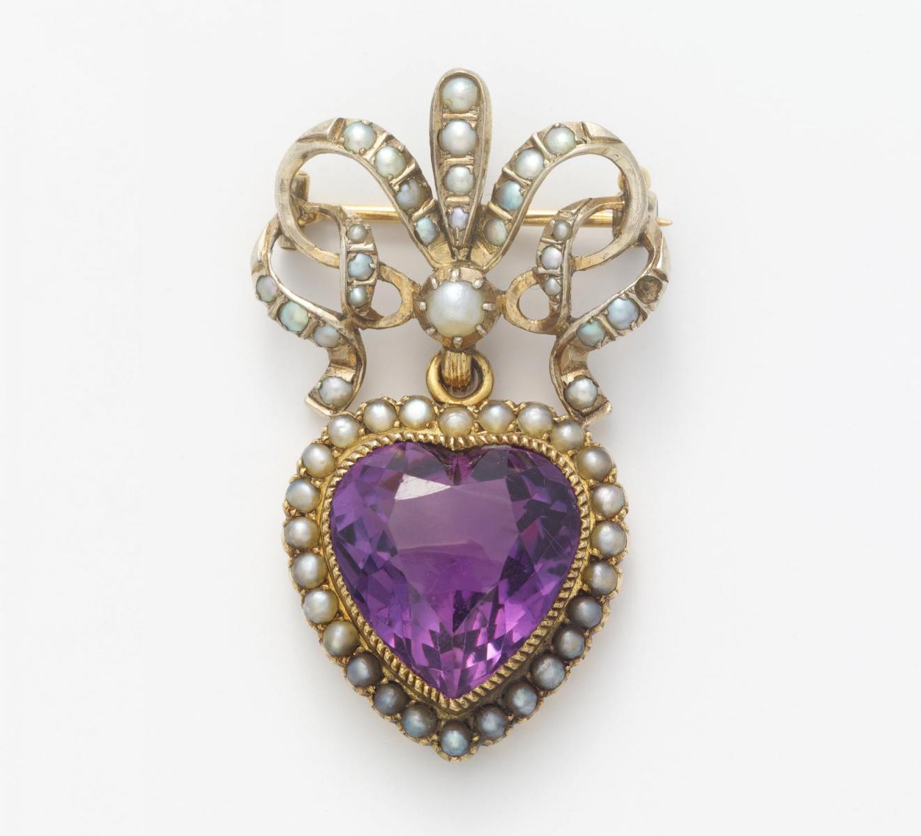 Silber/vergoldet, Gewicht: 13,0g. H x B=ca. 4,5 x 3,6cm. 1 Amethyst im Herzschliff, vielzählige Saatperlen, grau-grün-aubergine.