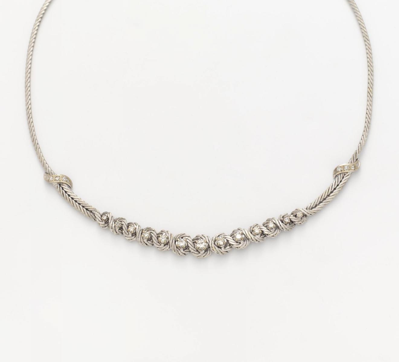 585/- Weißgold, gestempelt, Gewicht: 22,0g. L.ca. 42,5cm. 19 Diamanten im 8/8- und Brillantschliff.