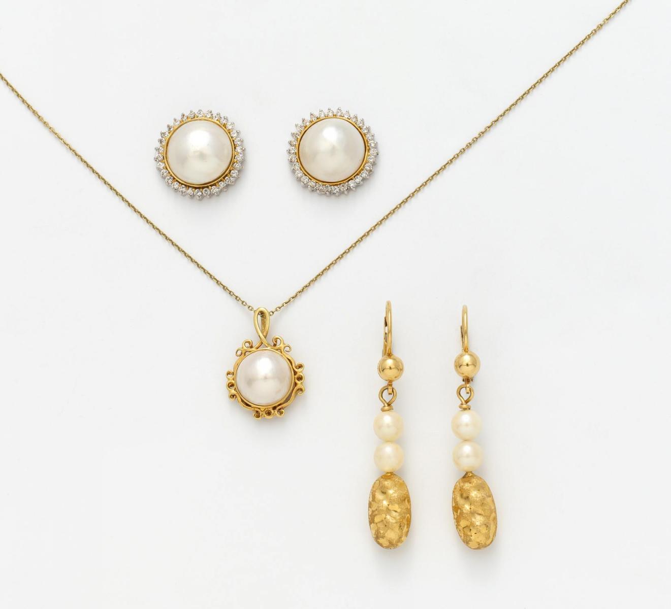 Ohrstecker: vielzählige Diamanten, Mabé-Zuchtperlen D.ca. 12mm; Ohrhänger: je 2 Süßwasser-