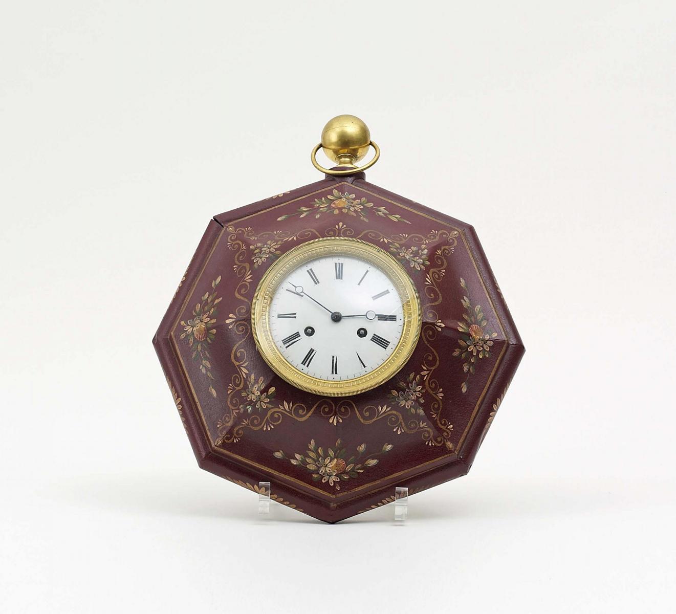 Metall, lackiert, farbiges Dekor. Pendulewerk mit Fadenaufhängung und Halbstundenschlag auf Glocke. H.41 cm. Zustand B/C.