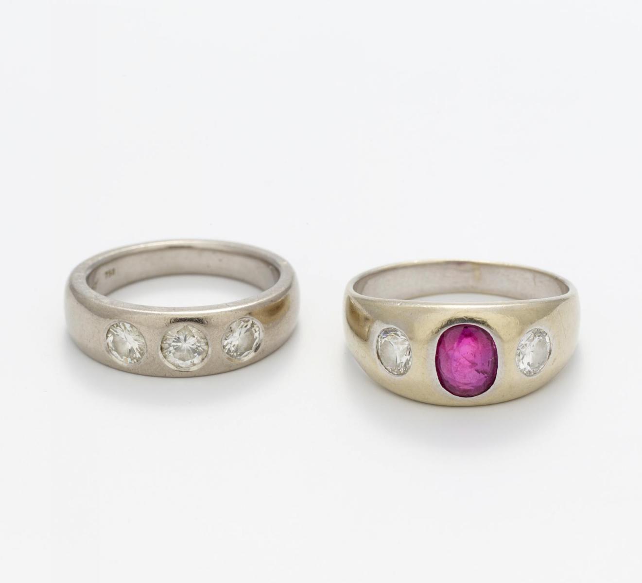 585/- und 750/- Weißgold, gestempelt, Gewicht: 1. 4,7g, 2. 6,0g. EU-RM: 51,5, 46,5. 5 Brillanten, 1 oval facettierter Rubin.