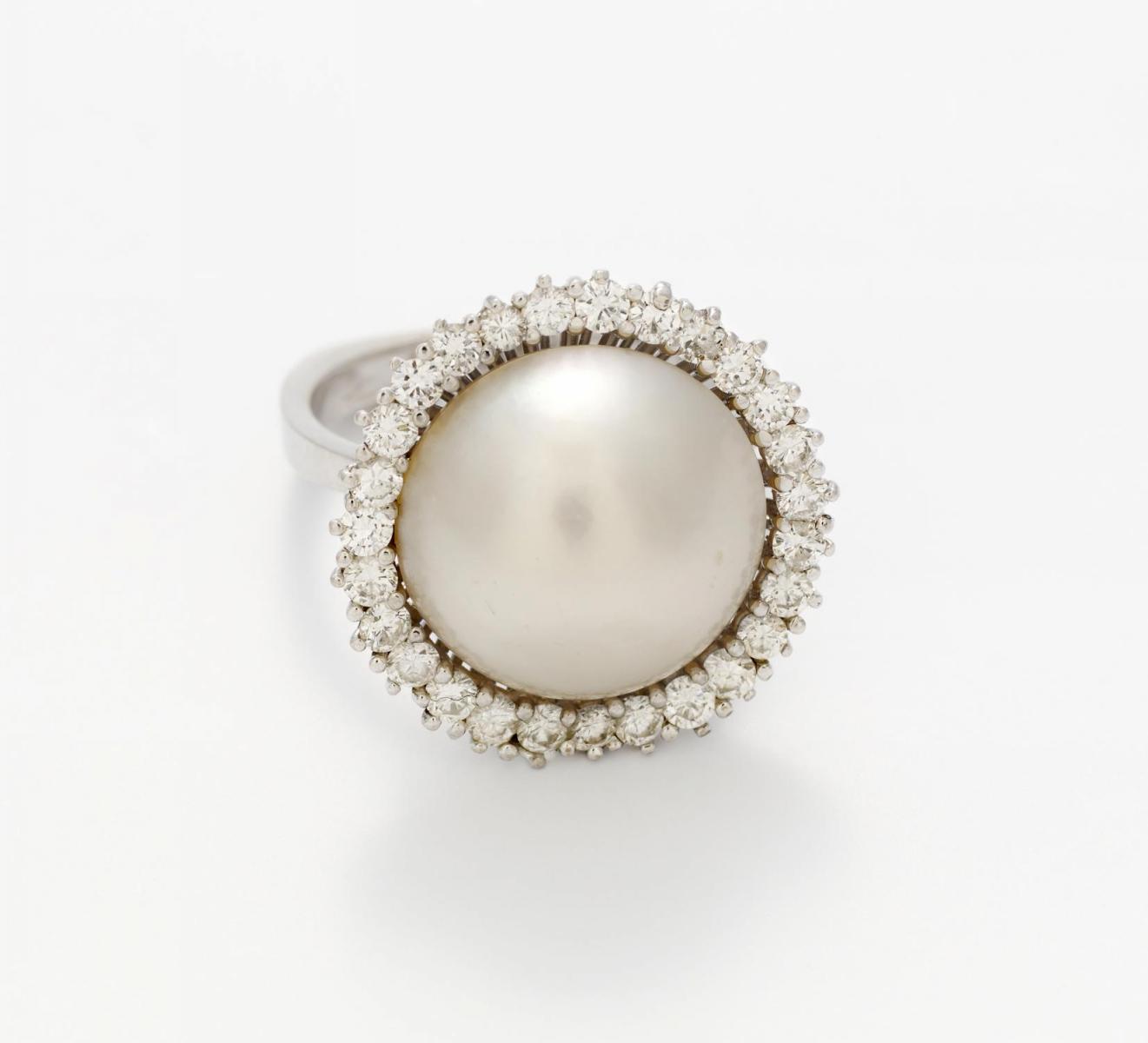 585/- Weißgold, gestempelt, Gewicht: 8,1g. EU-RM: 55,5. 27 Brillanten, 1 Mabé-Zuchtperl-Button, creme-irisierendes rosé, D. ca. 16mm.