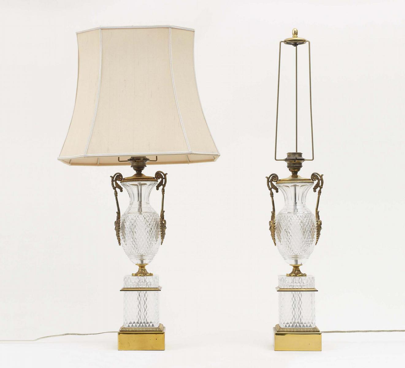 Kristallglas, Metallmontierung, Stoffschirm. H.83 cm.