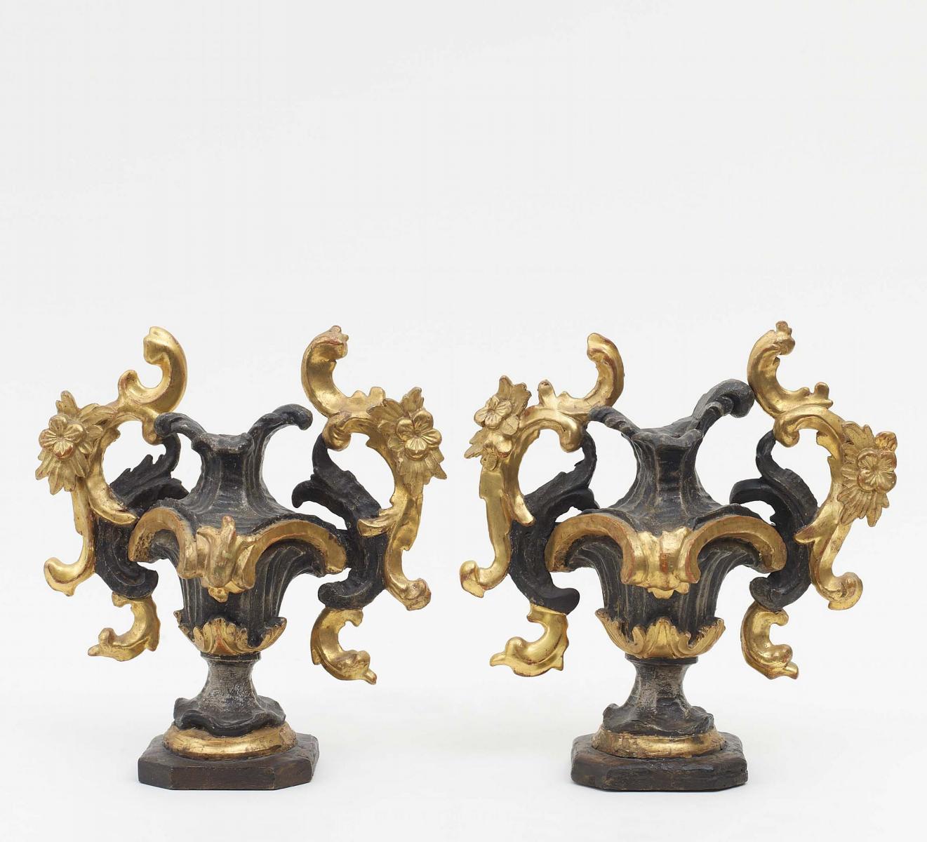 Holz geschnitzt, schwarz und gold gefasst. H.27,5 cm. Zustand B/C. Beilage: Paar Appliken. Holz.