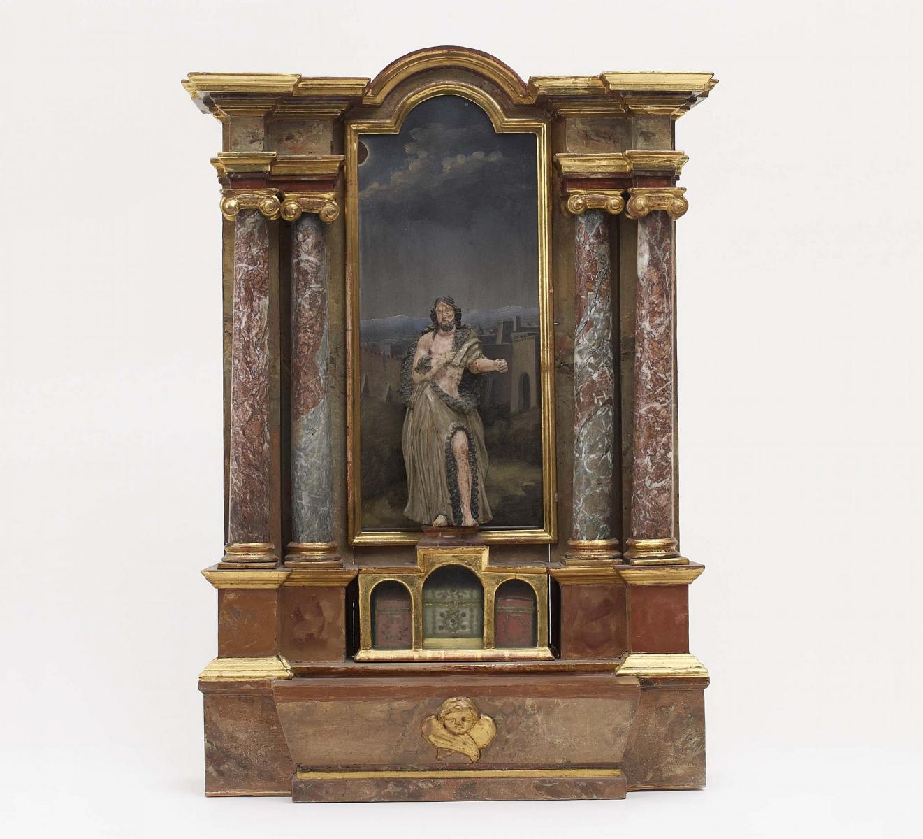 Holz, geschnitzt, farbig und gold gefasst. Marmor. Metall bemalt. 73x47x18 cm. Zustand C.