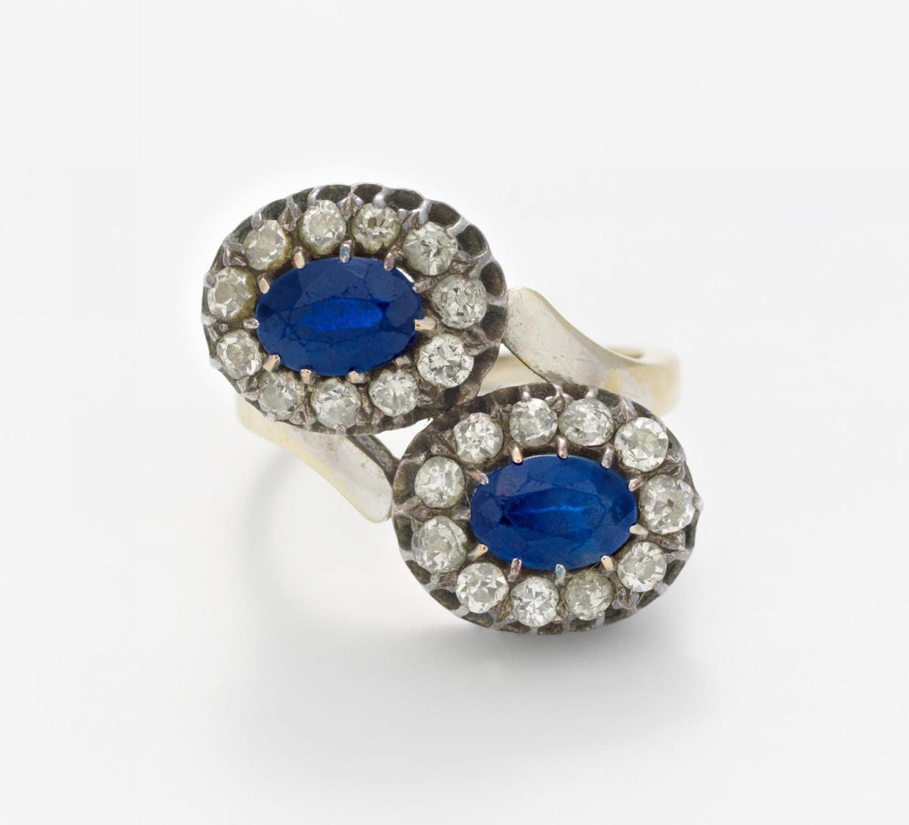 585/- Gelbgold, gestempelt (verschlagen), Silberverbödung, Gewicht: 6,4g. EU-RM: 50,5. Ringtop: H x B=ca. 2,1 x 1,9cm. 22 Diamanten, 2 oval facettierte Saphire mit Tragespuren.