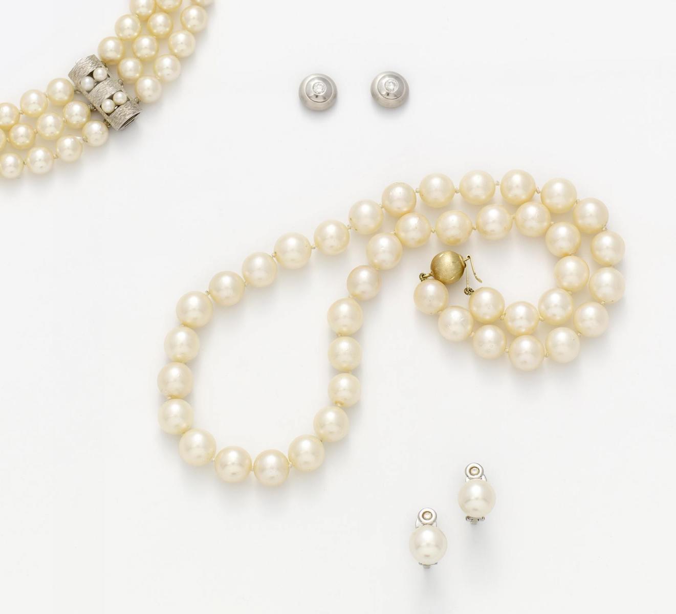 Ohrstecker: 585/- Weißgold; Perlohrclips: 750/- Weißgold; Zierschloss Armb.: 585/- Weißgold; Zierschloss Collier: 585/- Gelbgold. Alle gestempelt, Gewicht: zus. 87,0g. Collier L.ca. 41,5cm; Armb. L.ca. 19,0cm. Ohrstecker je 1 Diamant D.ca. 3mm; Ohrclips je 1 winziger Diamant, je 1 Perle weiß-rosé, D.ca. 9mm; Collier 42 Perlen, creme-rosé; Armband 75 Perlen zu 3 Strängen, creme-rosé sowie 4 kl. Perlen auf Zierschloss D.ca. 3mm.