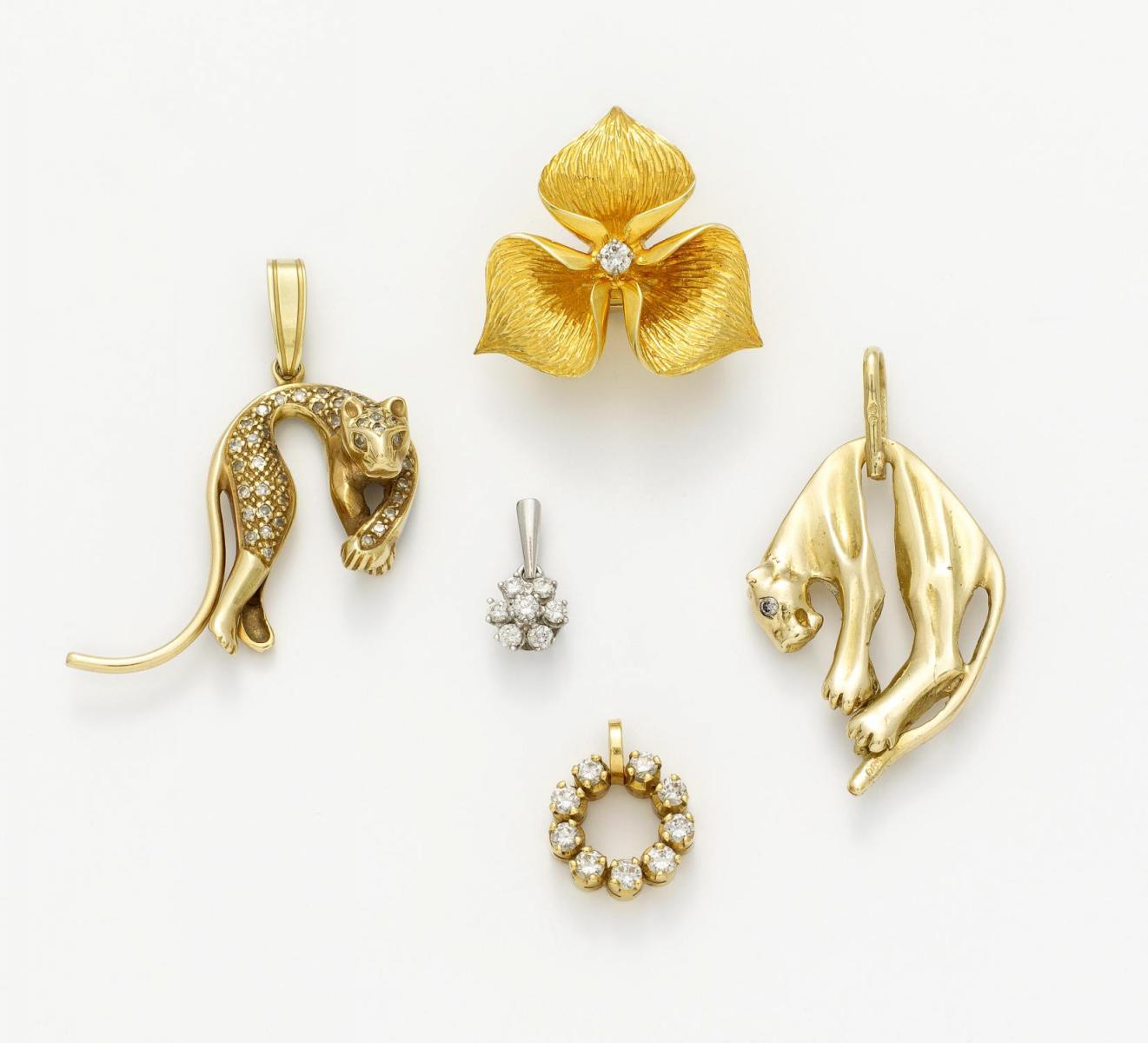 2 Pantheranhänger: 1. Goldfarben, Stempel verschlagen, ca. 8,5g, H. x B.=ca. 4,2 x 2,3cm,