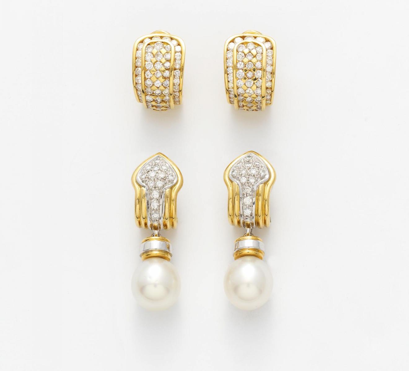 750/- Gelb-/Weißgold, Gewicht: 1. 13,5g, 2. 21,5g. 1. H x B=ca. 1,7 x 1,2cm, 2. L.ca. 3,6cm. 132 winzige Brillanten, 2 Akoya-Zuchtperlen, creme-irisierendes rosé, D.ca. 12,1mm.