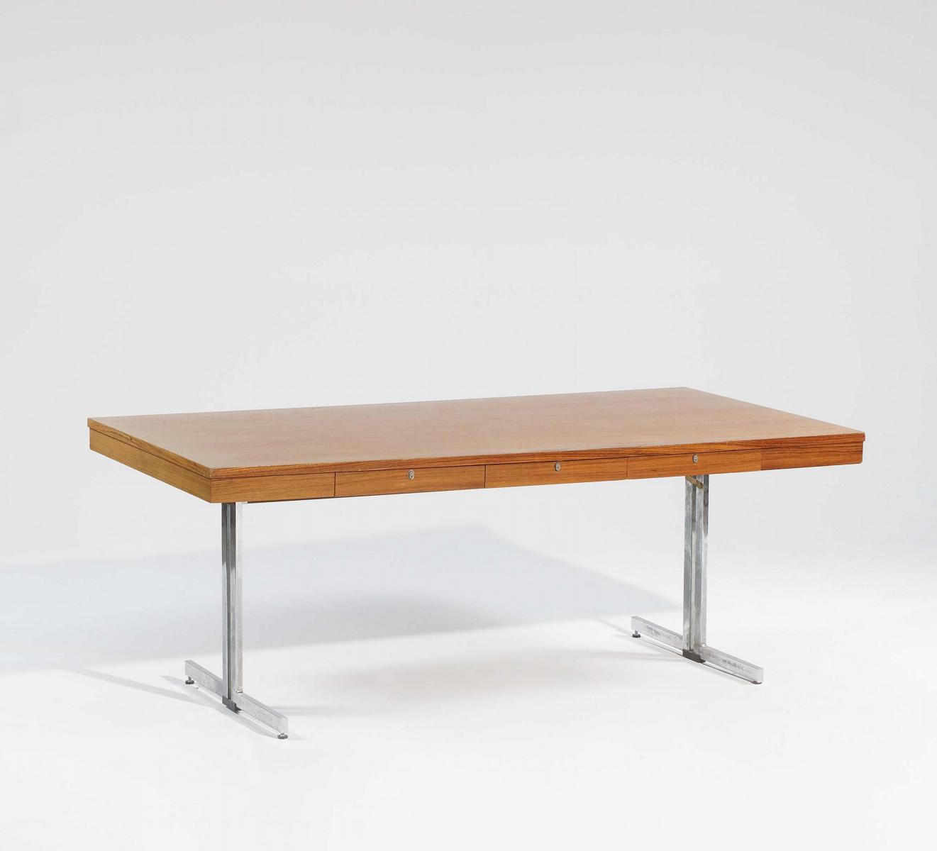 Holzplatte mit Eisengestell auf Rollen. 77x198x100 cm. Zustand C.