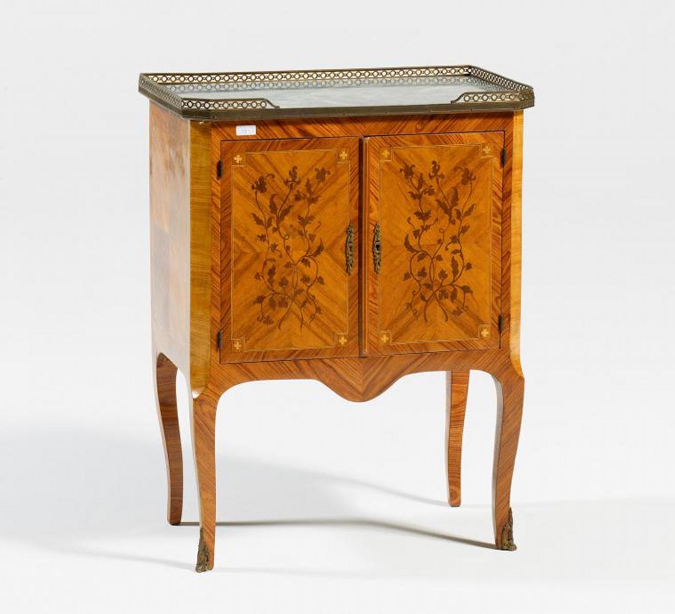 Rosenholz und andere Hölzer eingelegt, Marmorplatte. 86x66x40 cm. Zustand B/C.
