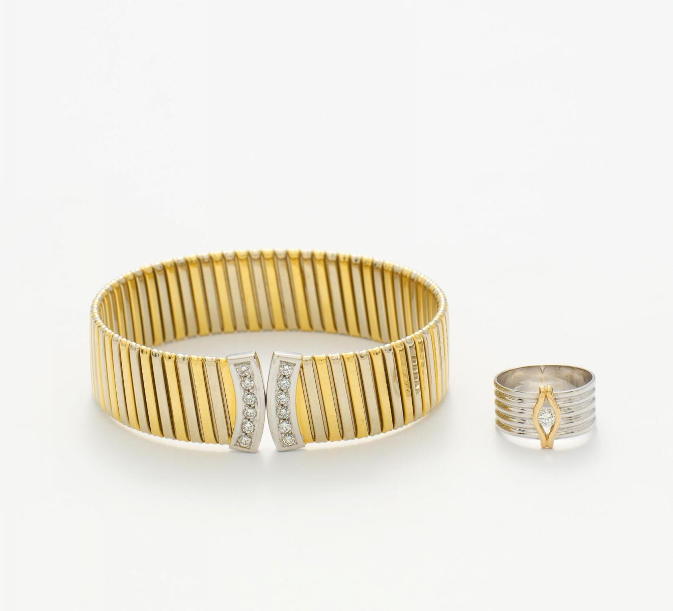 Armspange: 750/- Weiß-/Gelbgold, gest.; Ring: Gold-/silberfarben, Gewicht: zus. 48,5g. EU-RM: 49. L.ca. 19,0cm (dehnbar). 13 Brillanten.