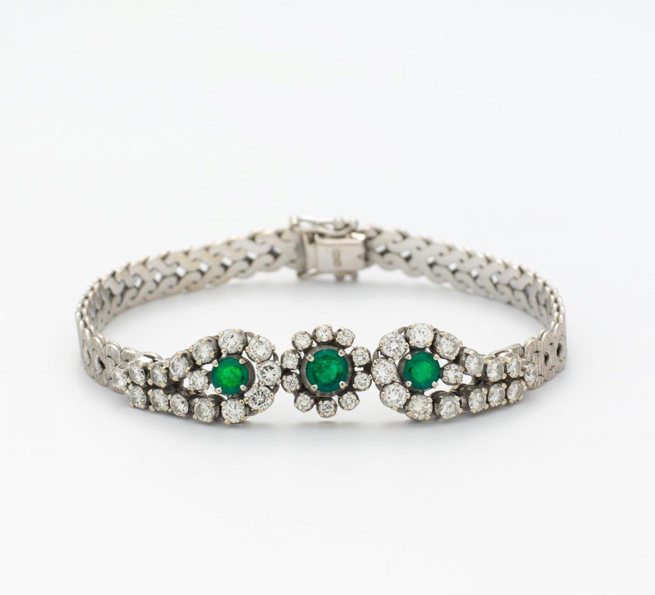 750/- Weißgold, gestempelt, Gewicht: 24.0g. L.ca. 19,5cm. 40 Diamanten im Brillant- und Altschliff, 3 rund facettierte Smaragde.