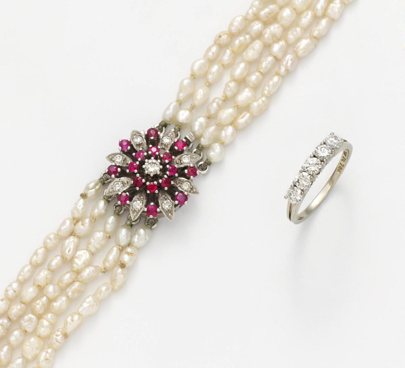Zierschloss: 585/- Weißgold; Ring: 750/- Weißgold, Gewicht: 1. 28,5g, 2. 2,8g. EU-RM: 53. Collier: L.ca. 33,0cm. 14 Brillanten, 16 rund facettierte Rubine, 339 Blister-Zuchtperlen, creme-rosé, D.ca. 7,5-3,1mm.