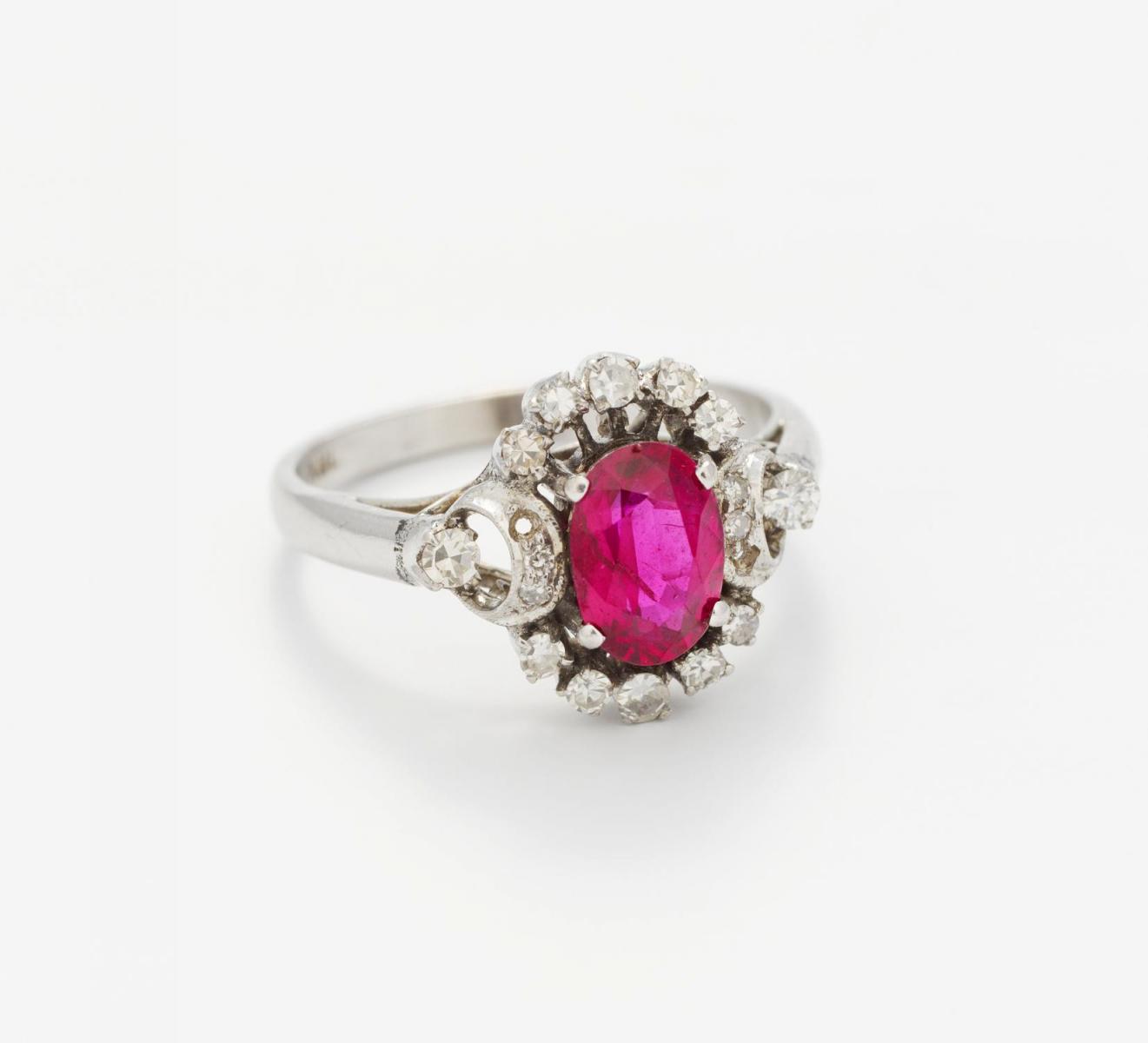 750/- Weißgold, gestempelt, Gewicht: 3,5g. EU-RM: 54. 1 Brillant, 15 winzige 8/8-Diamanten (zwei fehlend), 1 oval facettierter Almadin (Granat-Gruppe).