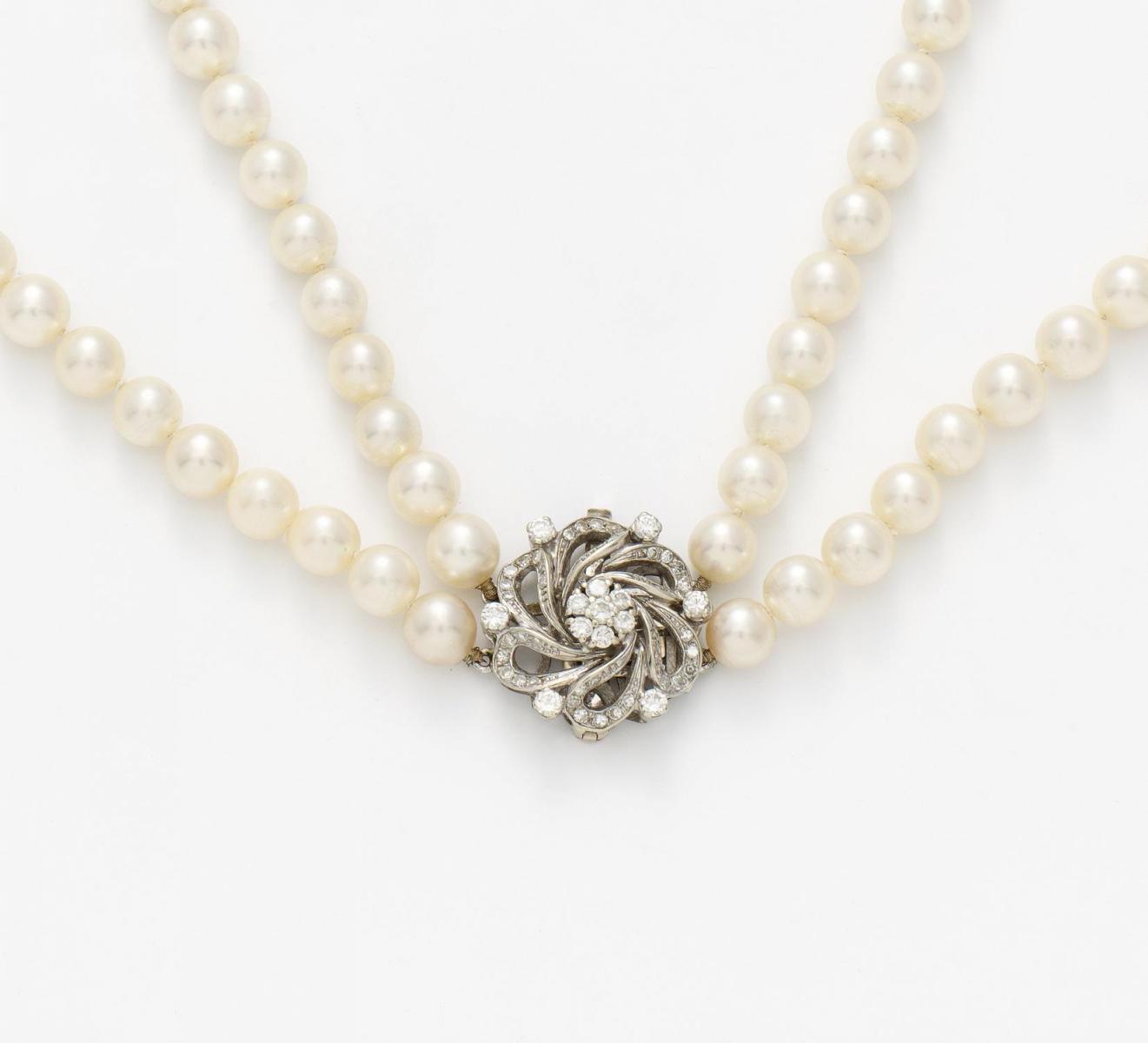 Zierschloss: 750/- Weißgold, gestempelt, Gewicht: 64,5g. L.ca. 45,0cm. 55 Diamanten im 8/8-, Alt- und Brillantschliff, 109 Süßwasser-Zuchtperlen zu zwei Strängen geknotet, weiß-rosé, D.ca. 7,1mm.