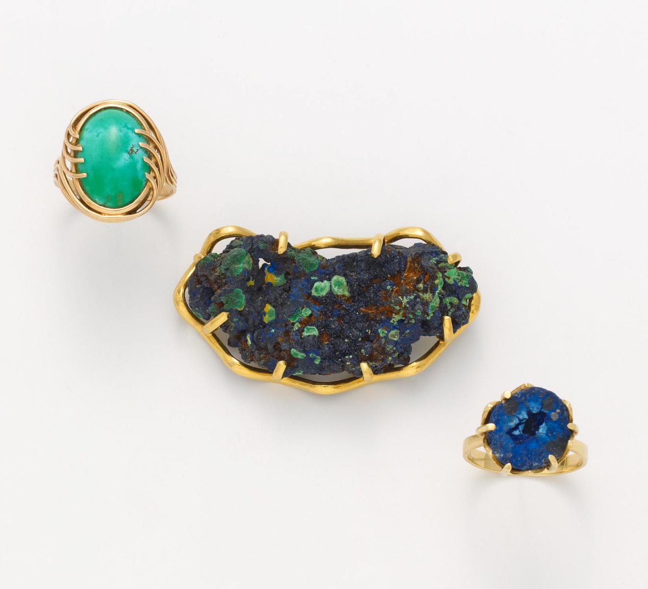 585/- und 750/- Gelbgold, gest. (verschlagen), Gewicht: 1. 28,1g, 2. 10,2g. EU-RM: 62. Ringtop: D.ca. 1,5cm, Brosche: H x B= ca. 3,2 x 5,4cm. 1 ovale und 1 runde Druse.