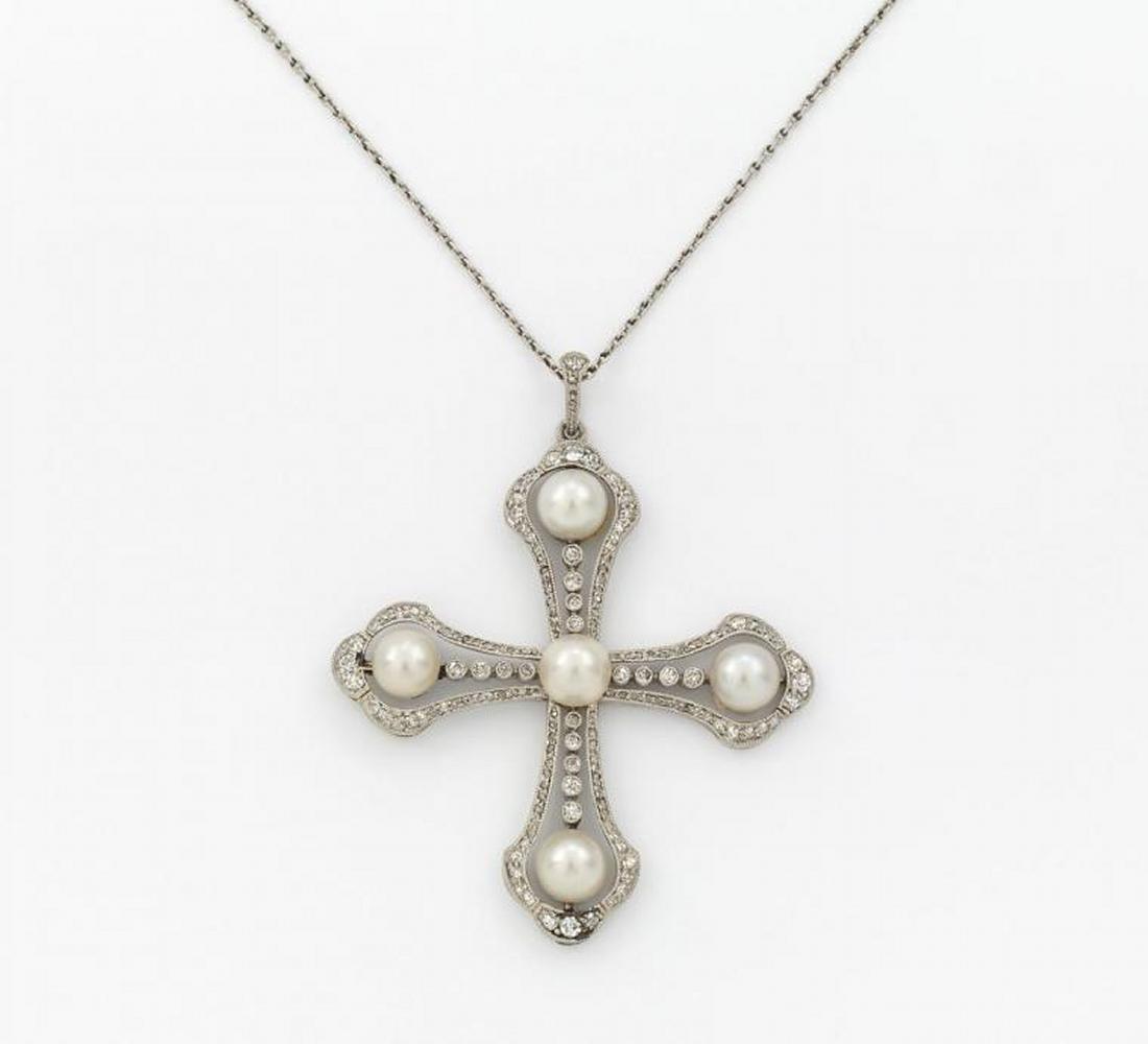 900/- Platin, Gewicht: 15,0g. L.ca. 42,5cm. Ca. 102 Diamantrosen, 5 vermutl. Naturperlen, Button, D.ca. 6,42mm, weiß, irisierendes rosé.