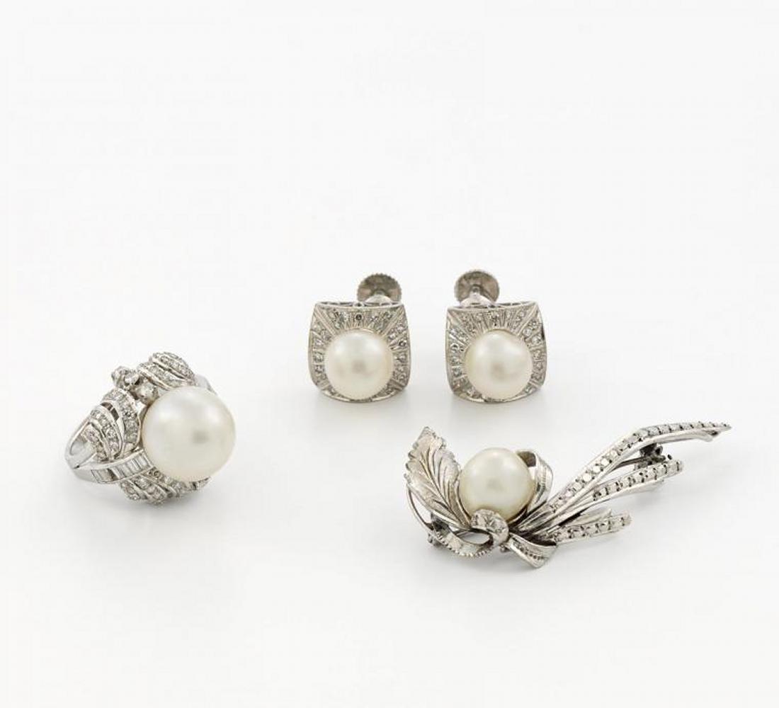PERL-DIAMANT-SET: RING, BROSCHE UND OHRRINGE.