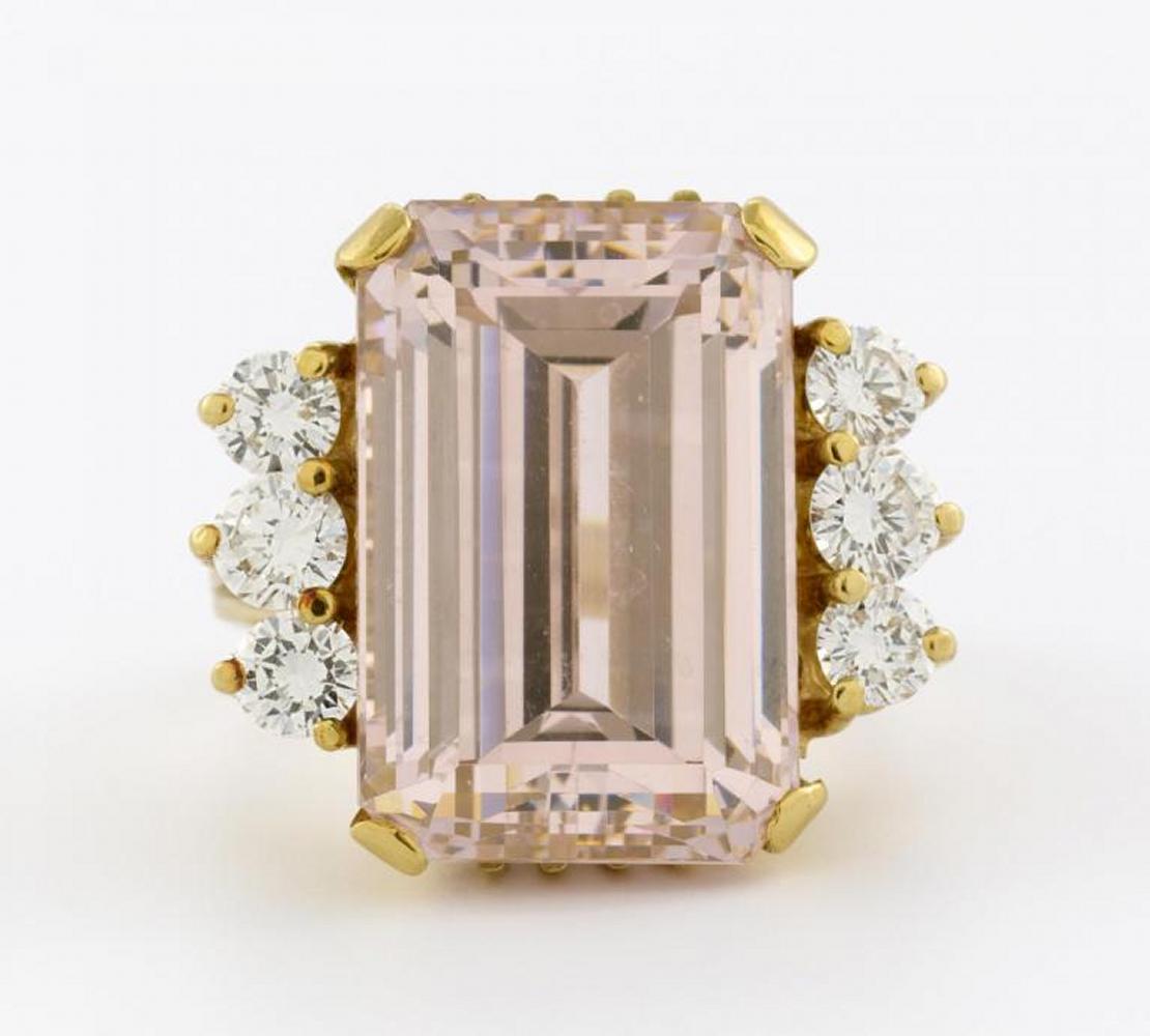 750/- Gelbgold, Gewicht: 13,5g. EU-RM: 52. 6 Brillanten zus.ca. 0,87ct W(H) VVS-VS, 1 Kunzit im Treppenschliff ca. 13,17ct.