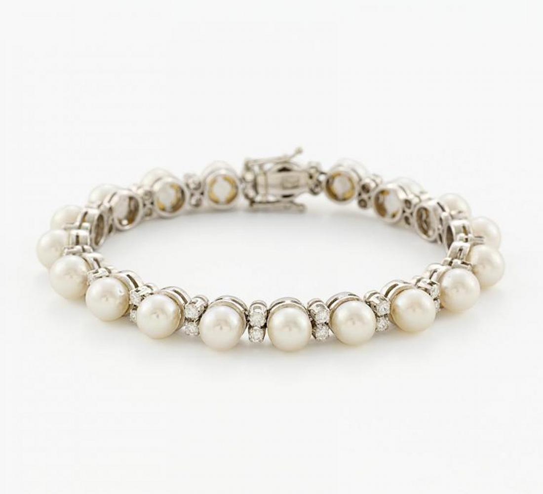 750/- Weißgold, Gewicht: 26,5g. L.ca 17,5cm. 38 Brillanten zus.ca. 1,14ct W(H) VVS-SI, 19 Akoya-Zuchtperlen D.ca. 6,65mm, weiß-irisierendes rosé-gelb.