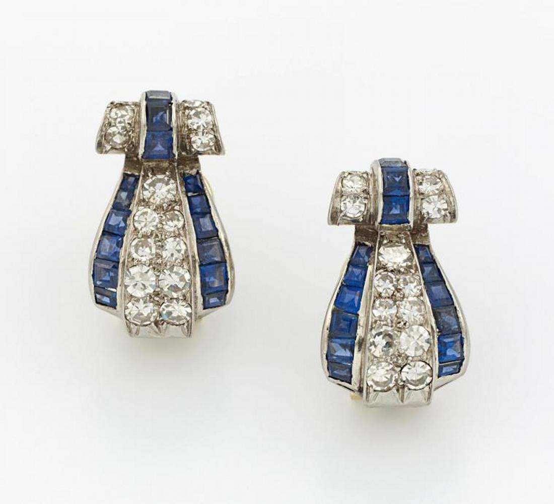 750/- Weiß-/Gelbgold, Gewicht: 9,4g. H.ca. 2,0cm. 30 8/8-Diamanten zus.ca. 0,94ct TCr(I) VS-SI, 30 facettierte Saphir-Karrees zus.ca. 2,10ct.