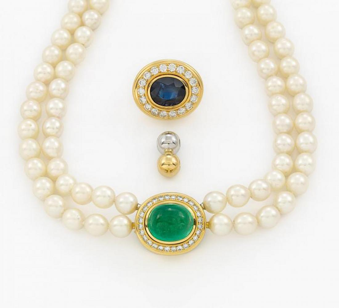 Zierverschlüsse: 750/- Gelb-/ Weißgold, Gewicht: 126,7g. L.ca. 43,0cm. 46 Brillanten zus.ca. 3,135ct TW(F-G) VVS-VS, 1 oval facettierter Saphir ca. 8,34ct, 1 ovaler Smaragd-Cabochon ca. 9,82ct, 92 Akoya-Zuchtperlen, rund-unrund, D.ca. 8,10mm, weiß-creme, irisirendes rosé.