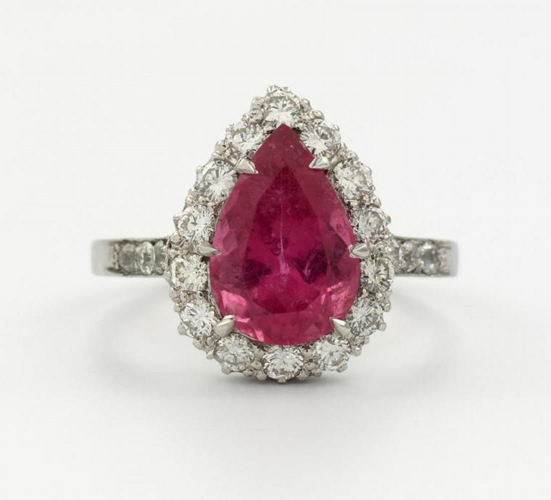 750/- Weißgold, Gewicht: 4,0g. EU-RM: 53. 20 Diamanten im Alt- und Brillantschliff zus.ca. 0,36ct, 1 facettierter, pinker Turmalin-Tropfen ca. 2,82ct.