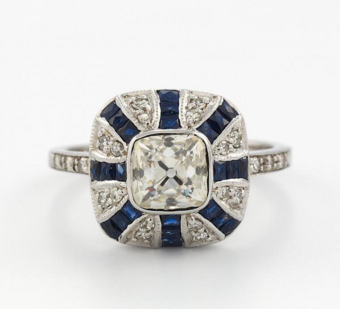 585/- Weißgold, Gewicht: 4,0g. EU-RM: 54. 1 Altschliff-Diamant im Karree ca. 1,46ct Cr(J) SI1, 22 8/8-Diamanten zus.ca. 0,066ct, 24 facettierte Saphir-Karrees zus.ca. 0,48ct.
