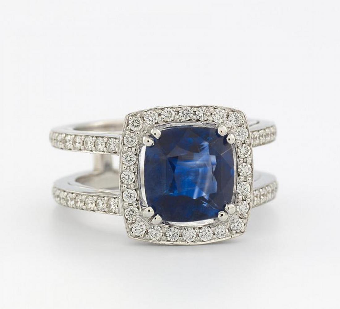 750/- Weißgold, Gewicht: 9,5g. EU-RM: 54. Ca. 72 Diamanten zus.ca. 0,85ct TW(F-G) SI, 1 facettierter Saphir im Scheren-/Sternschliff ca. 4,17ct, ca. 8,94x8,64x5,56mm.