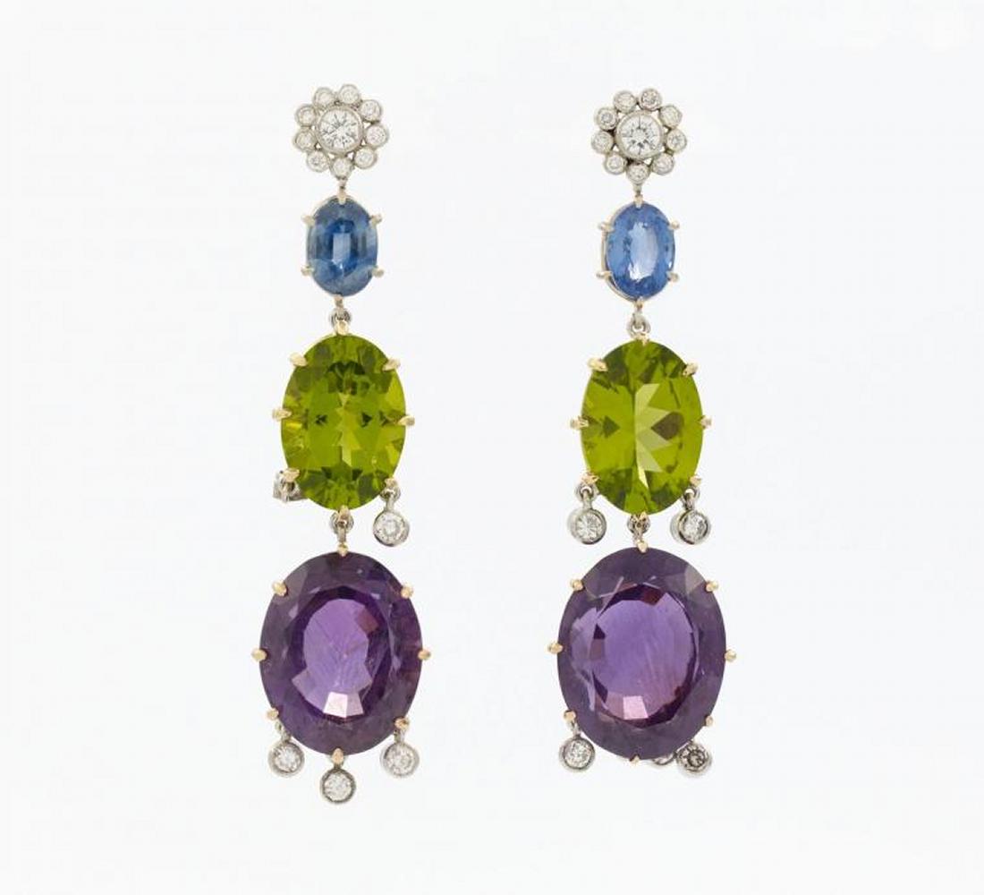 750/- Gelbgold, Platinverbödung, Gewicht: 19,7g. L.ca. 5,7cm. 30 Brillanten zus.ca. 0,35ct, 2 oval facettierte Saphire zus.ca. 2,28ct, 2 oval facettierte Peridots zus.ca. 11,88ct, 2 oval facettierte Amethyste zus.ca. 27,24ct.