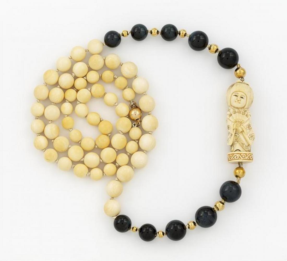 Zierschloss: 585/- Gelbgold, Gewicht: 110,0g. L.ca. 98,5cm. 5 Kugeln aus schwarzem Tigerauge, D.ca. 12,00-14,98mm, 56 Elfenbein-Kugeln, D.ca. 8,61-11,85mm, Netsuke: H x B=ca. 5,5 x 1,8cm.
