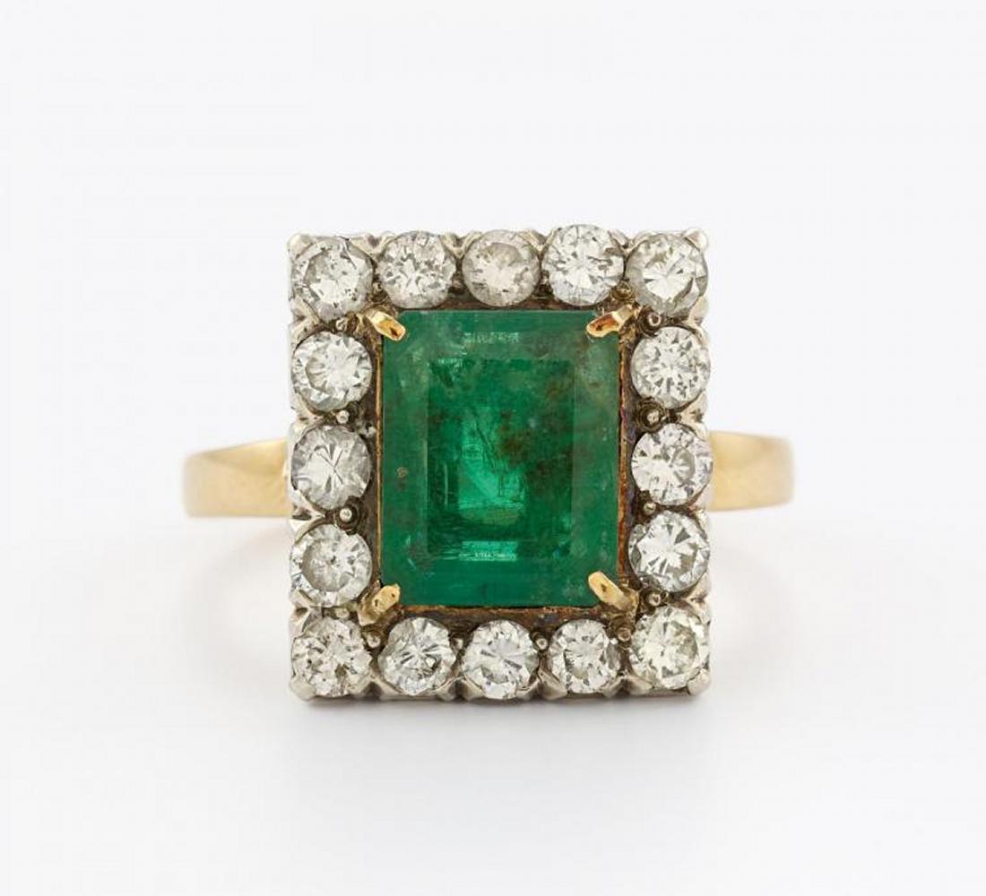 585/- Gelbgold, Silberverbödung, Gewicht: 6,5g. EU-RM: 55,5. Ringtop: ca. 1,5 x 1,4cm. 16 Brillanten zus.ca. 0,752ct TCr-Cr(I-J) SI-P1, 1 Smaragd im Emerald Cut ca. 2,03ct.