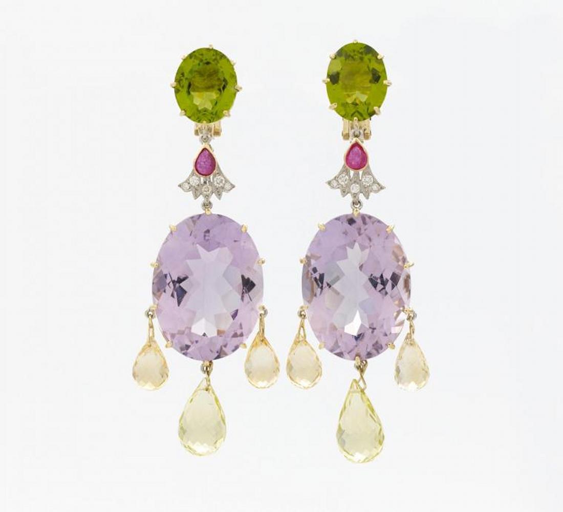 750/- Gelbgold, 950/- Platin, Gewicht: 25,1g. L.ca. 6,7cm. 12 Brillanten zus.ca. 0,06ct, 2 oval facettierte Peridots zus.ca. 8,7ct, 2 facetierte Rubin-Tropfen zus.ca. 0,30ct, 2 oval facettierte Amethyste zus.ca. 52,68ct, 4 facettierte Citrin-Pampeln, 2 facettierte Peridot-Pampeln.