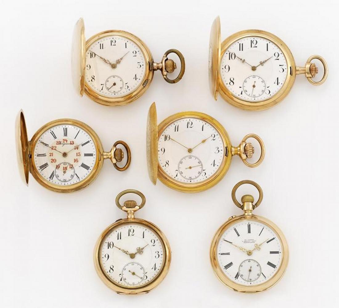 585/- Gelbgold. Gewicht: zus. 535,0g. D.ca. 4,9 - 5,9cm. Konvolut von sechs goldenen Herrentaschenuhren, teilweise mit Monogramm bzw. Widmung, u.a.